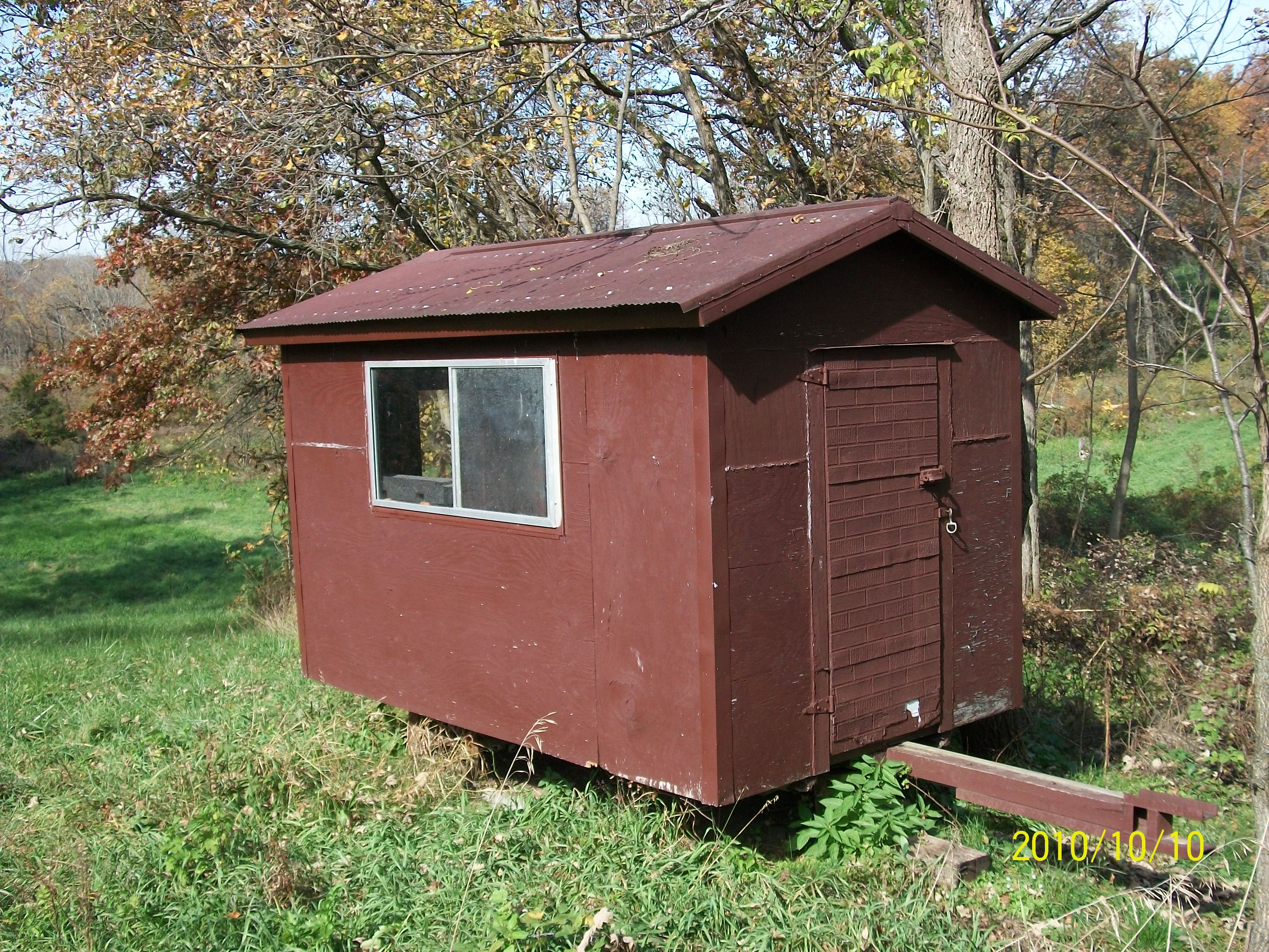 My delma came when I had to decide what to do with it. After special consideration, I felt the best use would be to retro-fit it as a hunting shack. Originally, there was a chicken door, 3 side-by-side windows, and a main door. Since the roof was okay, I spent most my time adding more windows, siding, gun rest, shelves, carpeting, seating, and for mobility, I added wheels and tongue (for those who don’t know – a tongue is the join connecting the trailer to the truck hitch).